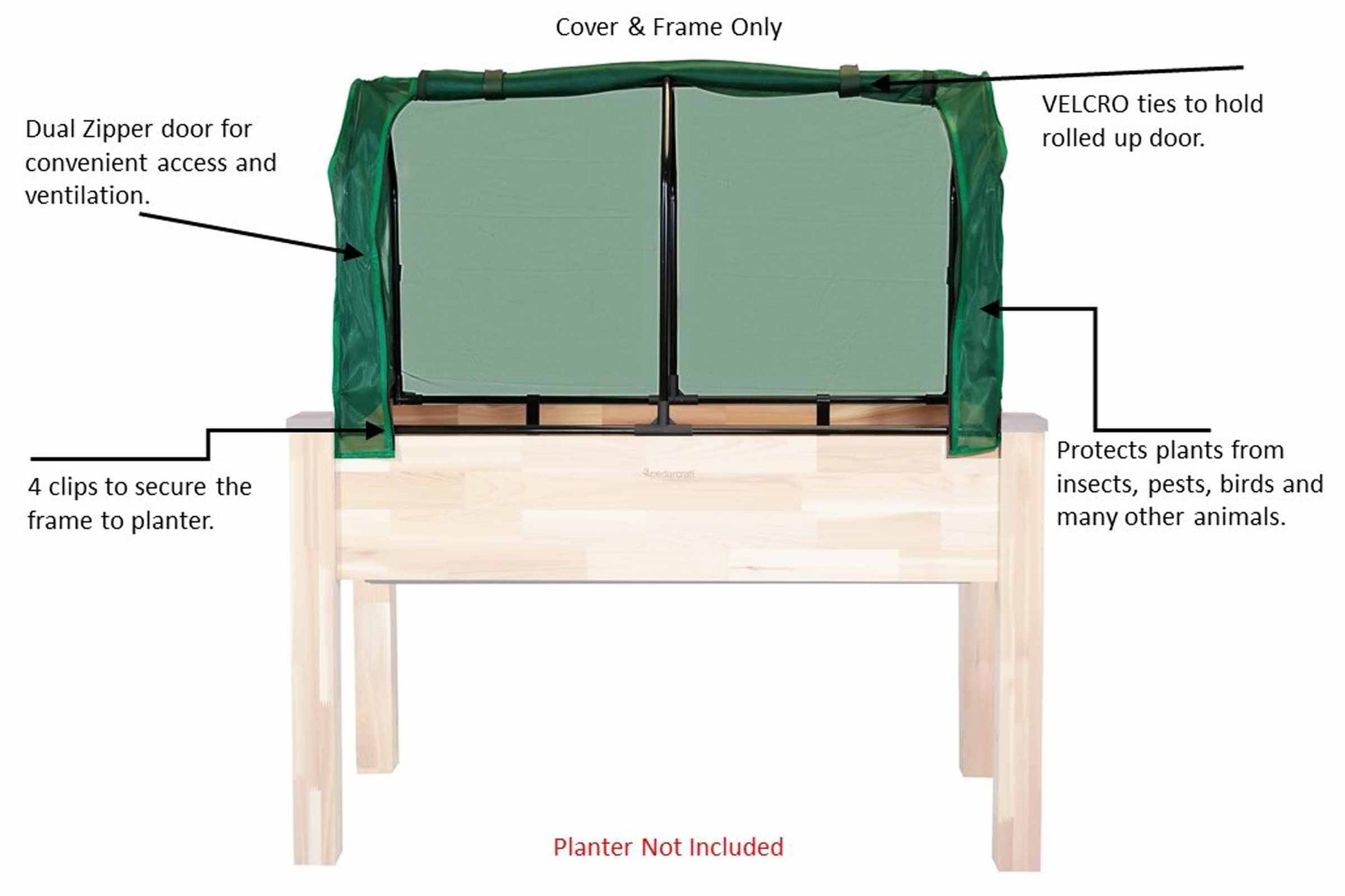 Le cadre en acier s'installe en quelques minutes grâce à des connecteurs pratiques et le cadre se fixe à votre jardinière pour garantir qu'il reste en place. Les couvertures sont fixées au cadre avec des languettes Velcro. Le couvercle ou tout le cadre peut être facilement retiré du pot. Les doubles portes à fermeture éclair facilitent l'accès pour assister ou récolter vos plantes.