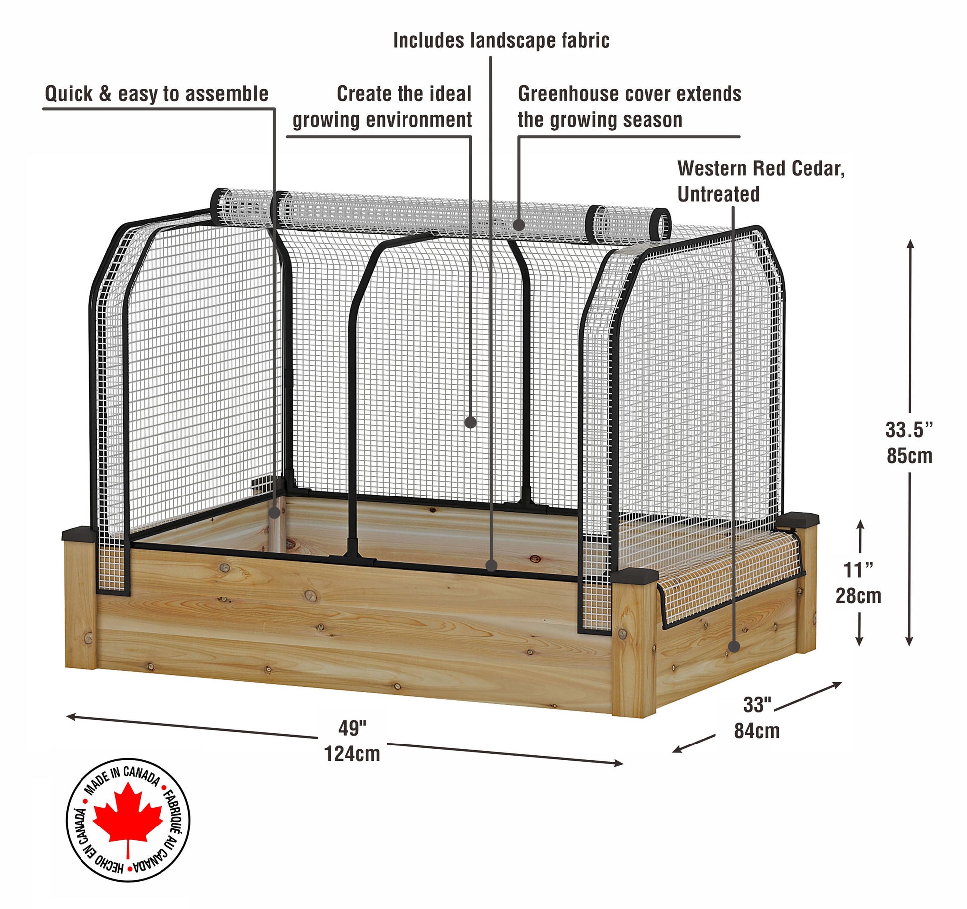 Cedar Raised Garden Bed (33 x 49 x 11"H) + Greenhouse & Bug Cover